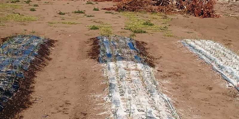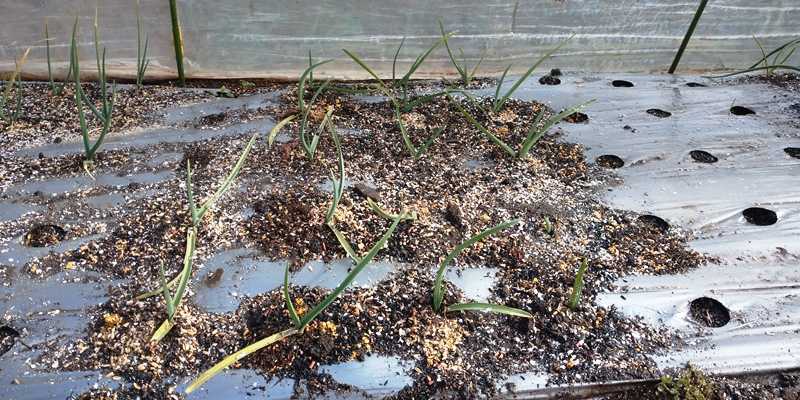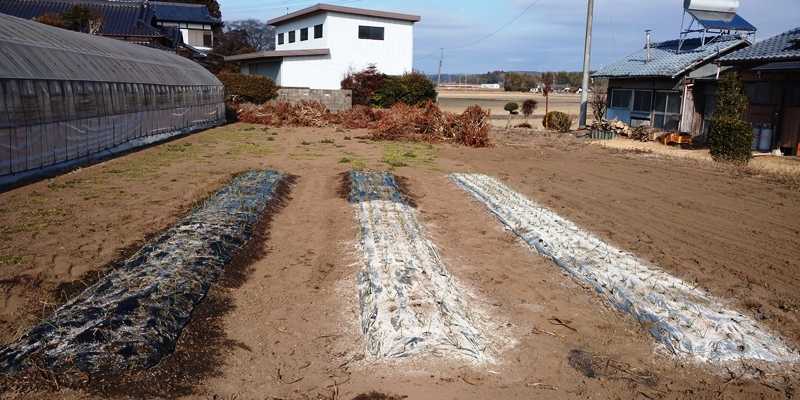 玉ねぎとにんにくに有機牡蠣殻石灰を散布して、カルシウム木酢エキスとタンニン鉄を希釈して灌水した。