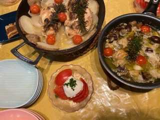 お皿は本日デビューのカレー皿。だけどいろいろ使える。黒はマットな感じで男前。白は釉薬が味を出してる。宮崎和佳子さんの作品をサラさんにお願いしてました。