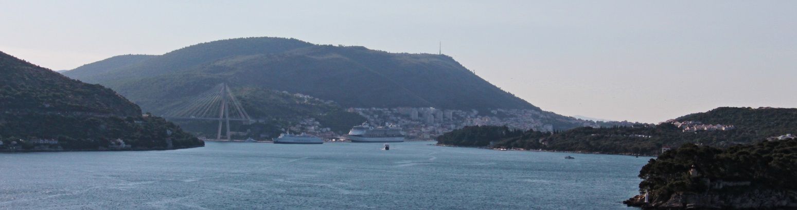 クロアチア・ドブロヴニクのとなり町、グルージュ港に8時30分に着く。世界遺産・ドブロヴニクの主要な海の玄関口である。良く晴れて、暑い日になりそうだ。 サランダから約360kmのクルーズ。バルカン半島の東沿岸を、アルバニア、モンテネグロ、そしてボスニアヘルツェゴビナを経て、クロアチアにはいる。ドブロヴニクは、クロアチアの最南端に位置し、「アドリア海の真珠」と称される。 周囲が小山と丘に囲また天然の良港・グルージュ港。フェリーターミナルからドブロヴニク旧市街地までの距離は2kmほど。しかしこの時期、車の渋滞が予想されるので、15分から20分間のバス移動を見込む・・。