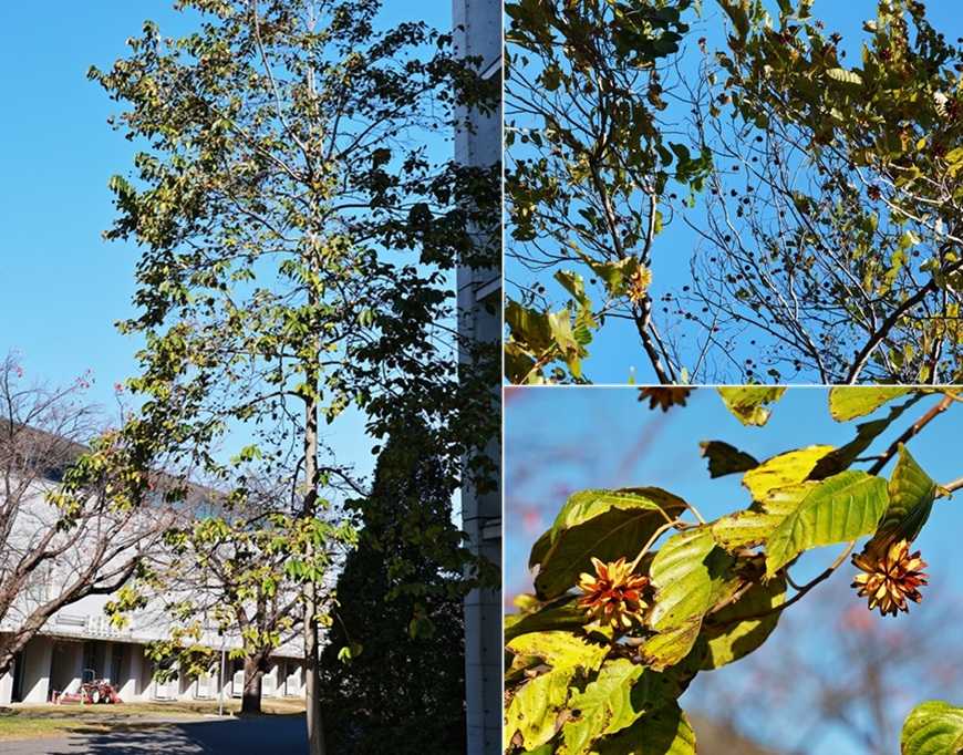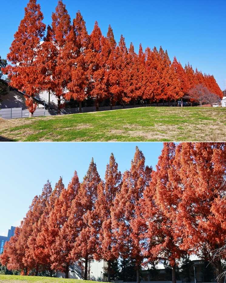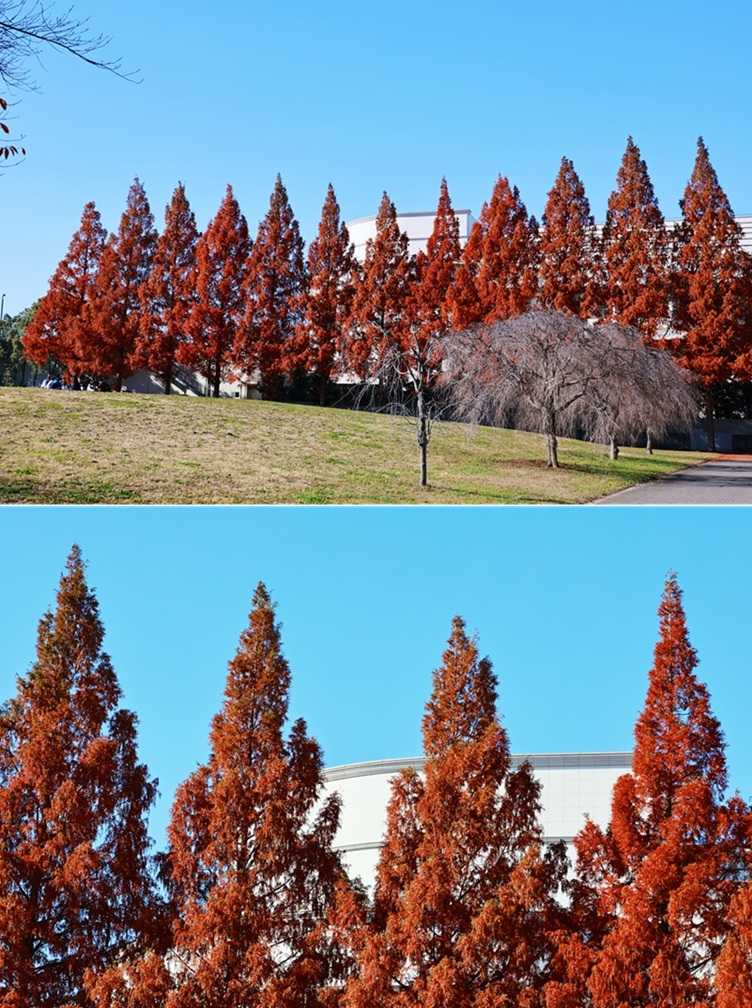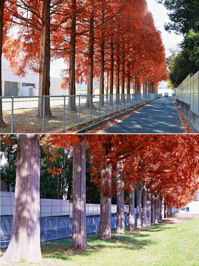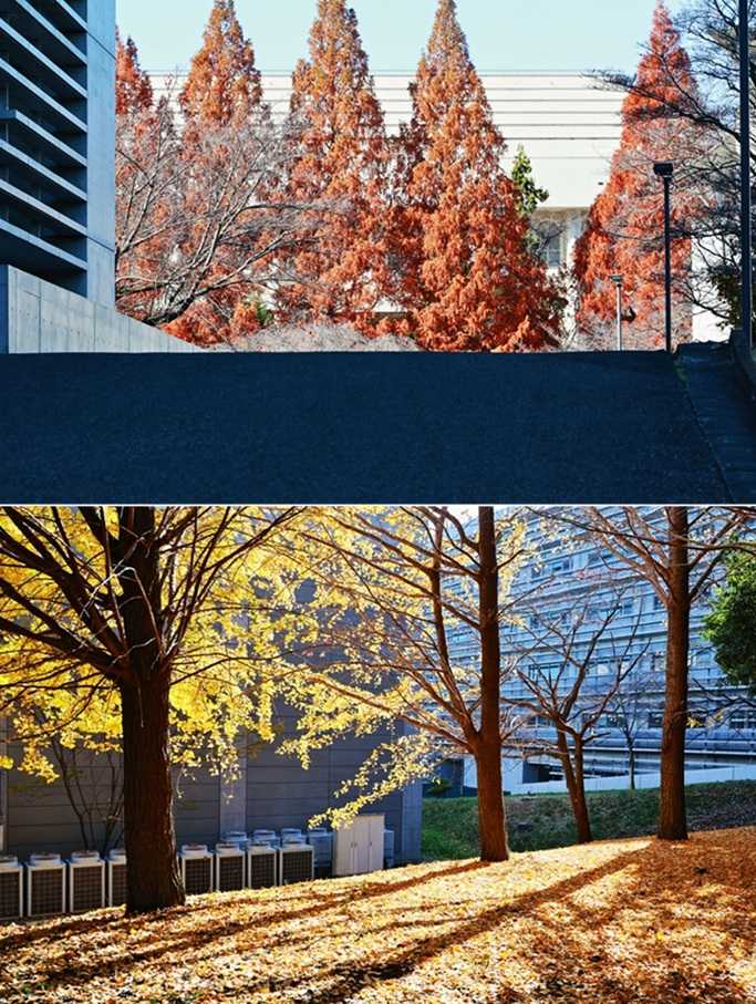 理科大野田キャンパスの東側道路沿いは、メタセコイア20本以上が一直線に並ぶ場所がある。樹全体に紅葉が進み、赤色とオレンジ色が混ざり合うような緋色になっている。暖色の帯のようだ。緋色は文学的な色として日本伝統的な色彩で、「思色(おもいいろ)」との別名もある。 「思色」は、色名としては古い。「古今和歌集」などの和歌にも見られたという。「思ひ」の「ひ」を火に、また火を「緋」にかけて生まれた色内とされる。心に熱く燃える情念の色を例えたという。また「心に思っている様子」を示す言葉として使わる。学生が樹の下で、何かを思い悩む姿が浮かぶ。 メタセコイアの樹形は、細長い二等辺三角形を立てたようにも見える。底辺を1として、斜辺を1.618とする「黄金三角形」に近いので、美しくて安定感がある形だ。また隊列を組むように並ぶ樹列は、とんがり帽子をかぶる兵隊の行進のようだ。幕末薩摩藩の歩兵の「とんきょ帽」を連想した・・。