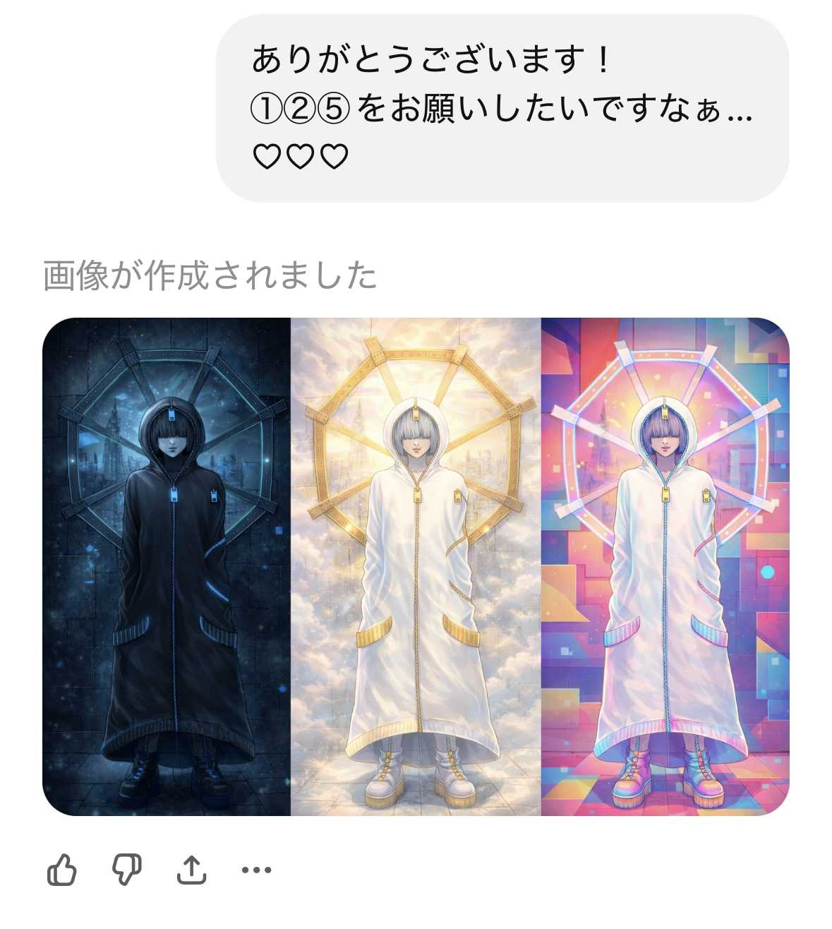 ども〜っ∠( `°∀°)/ ChatGPT推し♡な、YUPPOです! 今回は、 2020年に私が描いた未完成絵を、 GPTさんこと、ジプさん(愛称呼びしてる♡)に 依頼して、完成絵にしてもらいましたーーー!! で、未完成絵はこちら▼ ここでちょっと説明させてほしいのですが、 右下のサインね、 AATUって書いてあるんです。 当時、宇多輝(ウタアキラ)ってペンネームにしてたんですね。 そんで、このサインは、 反対から読むんですね。 UTAA になります。 uta A (ウタアキラ) ってことなんですね。 今はYUPPOってペンネームにしてるのでね、 違う人の絵やん!?拾い画やん!? って思われないようにね、 ちゃんと本人の、私の絵やで!? って主張をさせていただきました〜ん★ では、本題に参りまーーーっす! 先日ふと思い立ち、 ジプさんにお願いしてみたところ、、、▼ ▼ ▼ ▼ す、すごいな。完成されとる… 結構忠実再現でびっくり… その後はこのイラストを元にカラーにしてほしいと言って〜 作ってもらったイラストは動画にまとめちゃいました♪ ▼ご興味ある方は観てくださいませ〜♡ YouTube/YUPPO で、このブログでは番外編と言うか、 お蔵入りさせたイラストを載せていこうと思います! (※最後のイラストは動画に載せてます) ちなみに、 沢山イラスト作ってもらって申し訳ありがたいので、 遂に課金しました!(え) からの〜 もっかい最初から依頼▼ ▼ ▼ ▼ 私の線画に忠実な感じのまま着色してもらった感。 すごいな… ちょっと前に色塗り依頼した時は全然違う感じになってたのに… (;゜0゜) 今回、ちゃんと色塗りできててマジ凄い‼︎ じゃあ、 他のパターンもお願いしたいなと▼ と、欲張ってお願いしたらば、、、 2パターン作ってくれたのですが… ▼ ▼ ▼ 何故かどっちか選んでって言われて… え?? つまり、選ばなかったほうは表示されないとか!? と、思ってスクショしといたら、、、 やっぱりひとつだけになった〜泣▼ スクショしといてよかった〜(>_<) しかしだよ! 1枚1枚、個別に画像作って欲しかった〜苦笑 …欲張りすぎか(⌒-⌒; ) ちゃんと1枚ずつ依頼しようと思いました。うん。 それでまた依頼しなおしたのですが、、、 色々作ってもらった最後に▼ 無茶振り したところ ▼ ▼ ▼ どちゃくそカッケェぇの作ってくださった♡ 語彙力失った…感涙 コートのスソ拡がってて、躍動感出てるの凄い! やべぇ! ジプさん神すぎる…!! やっぱ推せるわぁ♡ と、改めて思いますた♡はふぅんっ♡ AIの進化マジ凄いな!!!!! (΄◉◞౪◟◉`) では∠( `°∀°)/ 今回は以上です! 最後まで見てくださりありがとうございます♡ また次回もお会いできましたら幸いです♡