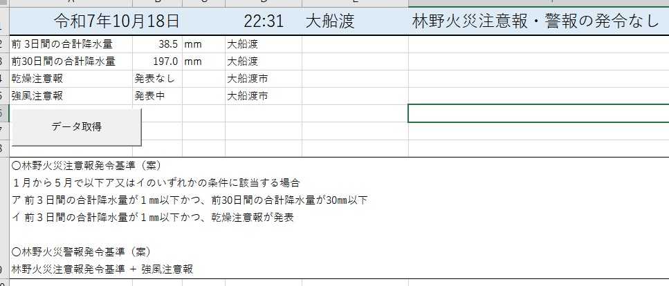 1月から5月で以下ア又はイのいずれかの条件に該当する場合 ア 前3日間の合計降水量が1㎜以下かつ、前30日間の合計降水量が30㎜以下 イ 前3日間の合計降水量が1㎜以下かつ、乾燥注意報が発表 〇林野火災警報発令基準(案) 林野火災注意報発令基準 + 強風注意報 について、エクセルで自動処理できないかと考えてみました。 最近はAIがVBAを作ってくれるようなので、マイクロソフトのAIを使用しました。 ↓ できました。 ![]() 〇気象庁のページから、前3日間の合計降水量と前30日間の合計降水量を取得します。 〇注意報情報は気象庁から上手くとれずにYahoo!から取得しました。 スプレッドシートを使えば、無料でスマホでも動作します。 作成できました。時刻指定で毎日実行して、メール送るとかもできます。グーグルすごすぎです。 ↓