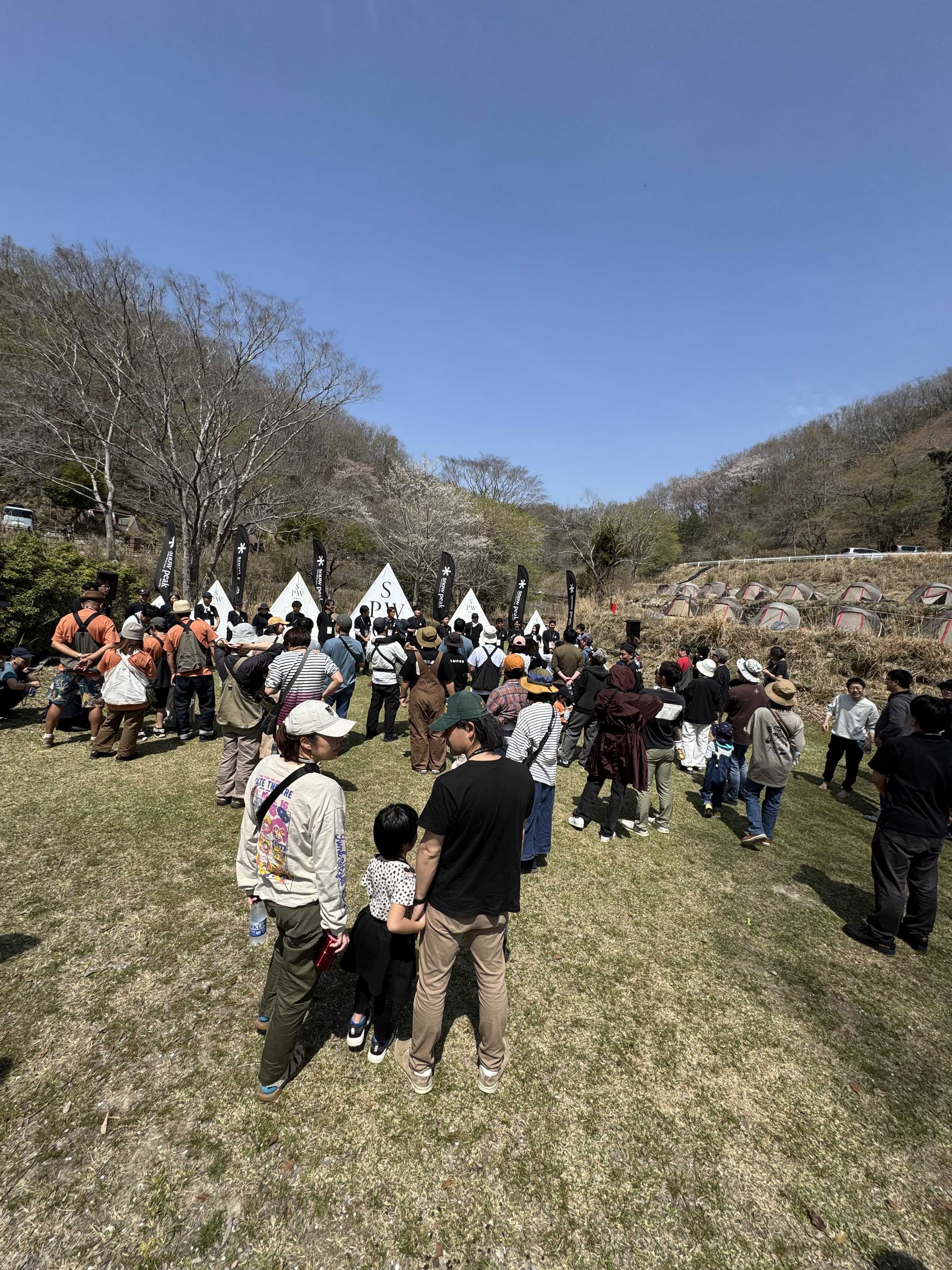 私はランドロックを設営。 到着時間がギリギリだったのですでに他の参加者さんは設営が済んでおり、私が設営中に、子供達はイベント参加したり楽しんでました! 無料でサントリーのノンアルコールビールの配布やジュースの配布などもありました。おそらく協賛だとは思いますが。 設営後は夕飯の支度。 雪峰苑を出して、お肉を焼いたて野菜に巻いて食べました。美味しい。 ご飯はうちは圧力鍋を持って行って時短。 子供達はテント前で写真撮影したり、普段経験できないキャンプ場の雰囲気を楽しんでました。 夜は スノーピークのイベントの楽しみといえば、焚き火トークの時間。